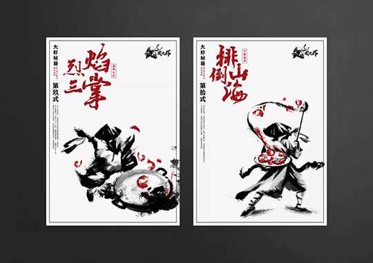 在設(shè)計(jì)上將大蝦秘籍的概念,融入了各式餐飲品牌VI設(shè)計(jì)物料內(nèi),并且延續(xù)中國風(fēng)武俠的實(shí)際風(fēng)格,化繁為簡,讓品牌升級(jí)更完整。