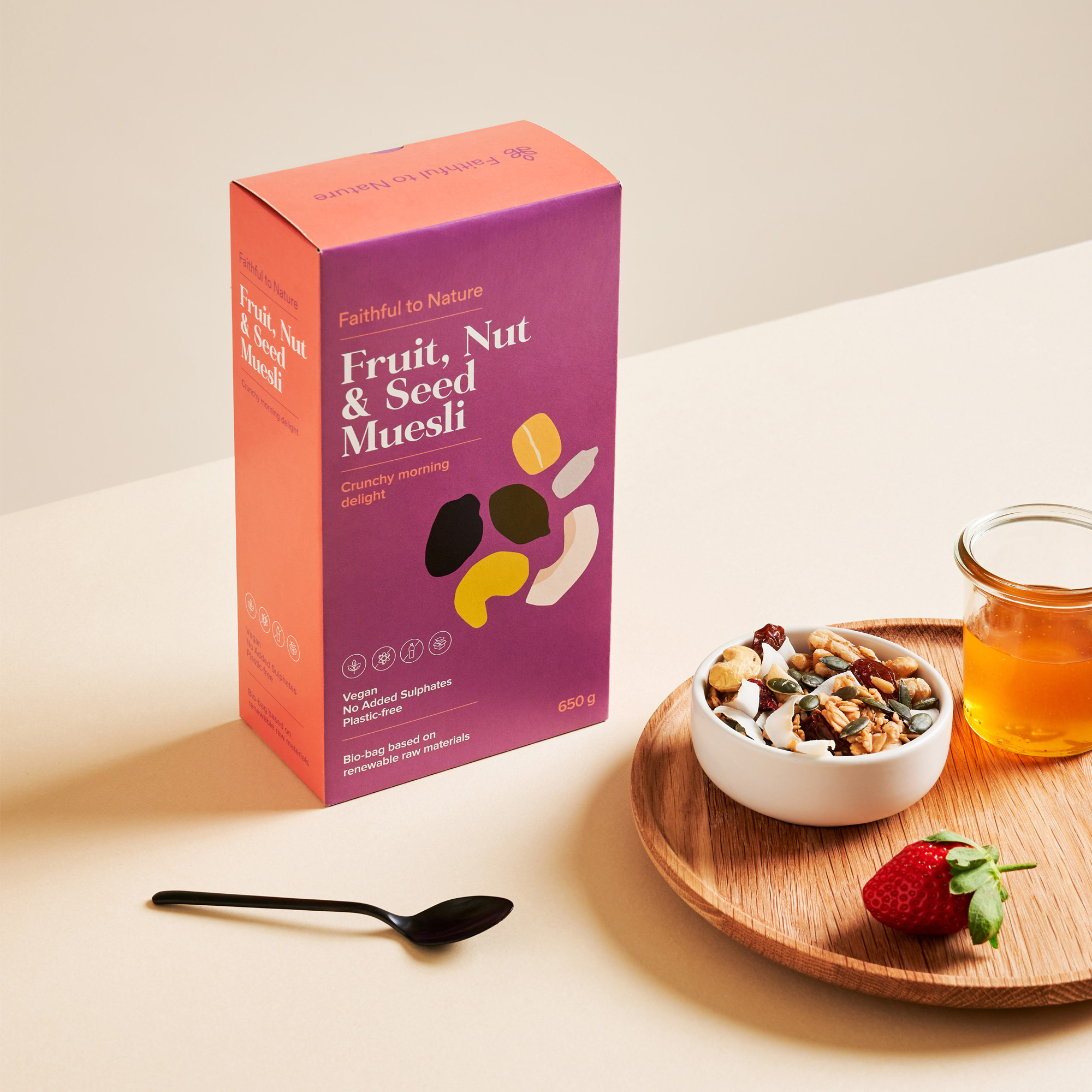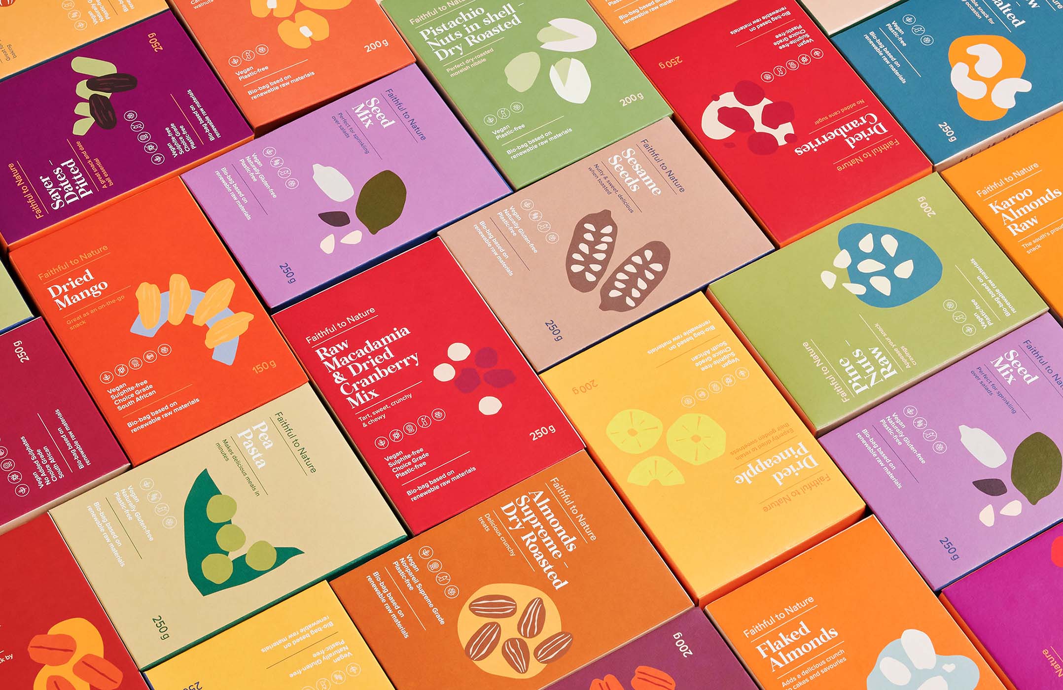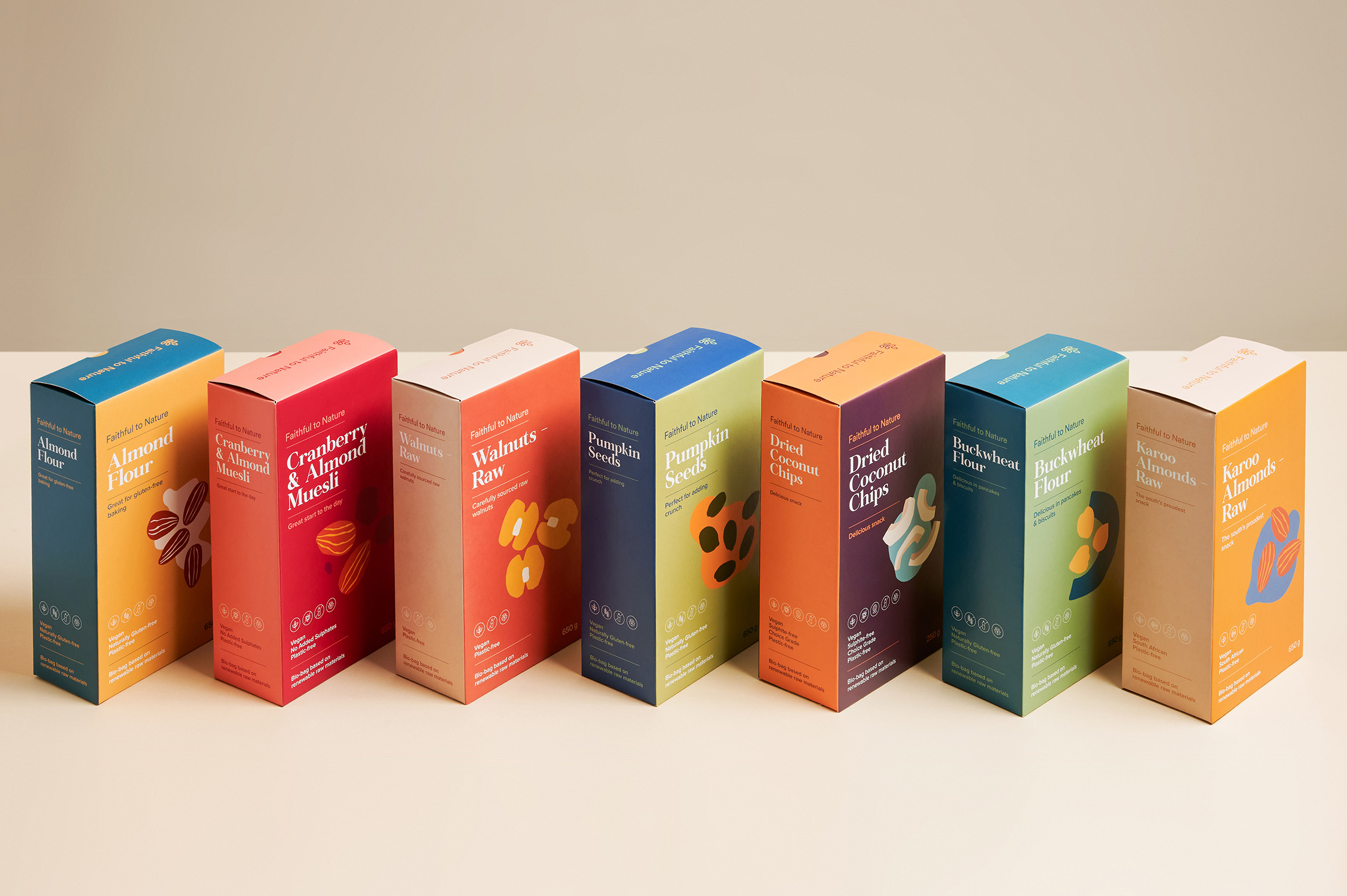 共同的元素,如標(biāo)志設(shè)計(jì)定位,字體和標(biāo)題層次仍然貫穿于所有產(chǎn)品,以創(chuàng)造一致性,跨越所有范圍,并喚起品牌認(rèn)知度。包裝設(shè)計(jì)忠實(shí)于大自然的標(biāo)志性無廢料包裝,有環(huán)境之心。儲(chǔ)藏室的貨物都是用植物纖維素制成的袋子,F(xiàn)SC認(rèn)證的盒子里印著植物用的墨水.所有忠實(shí)的自然紙箱是100%堆肥。