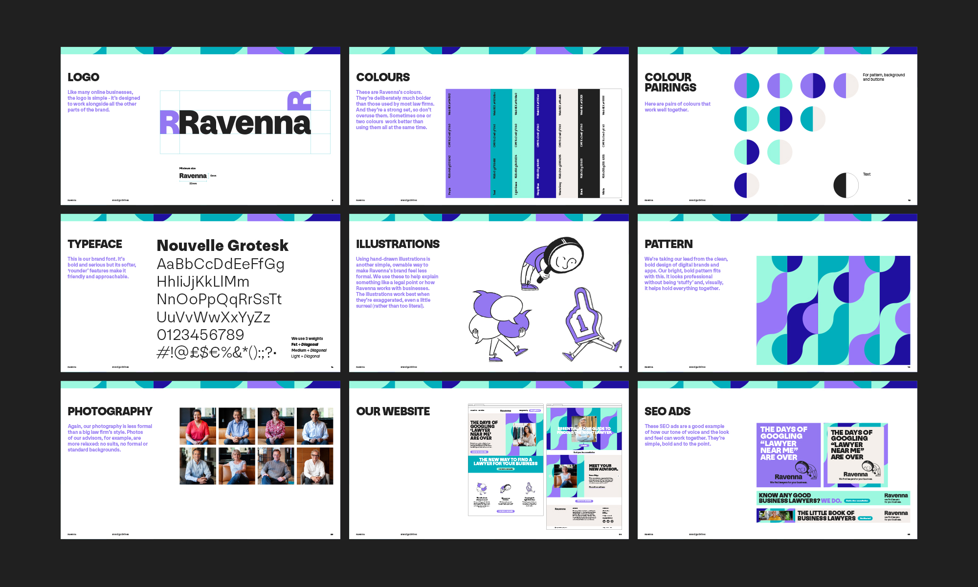 我們與超級語音專家 We All Need Words 合作,為 Ravenna 創(chuàng)建了一個(gè)大膽而引人入勝的視覺標(biāo)識設(shè)計(jì)。這是一個(gè)為通常被認(rèn)為是安全的世界創(chuàng)造新事物和有趣事物的機(jī)會。我們希望給 Ravenna品牌形象設(shè)計(jì) 一個(gè)既不同、獨(dú)特又多彩的外觀和感覺,以幫助將一家律師事務(wù)所帶入數(shù)字世界,并避免與該行業(yè)相關(guān)的任何常見的刻板印象。由于這是針對新成立的企業(yè),它需要吸引新的和現(xiàn)代的觀眾,他們不怕與眾不同并探索新的途徑。