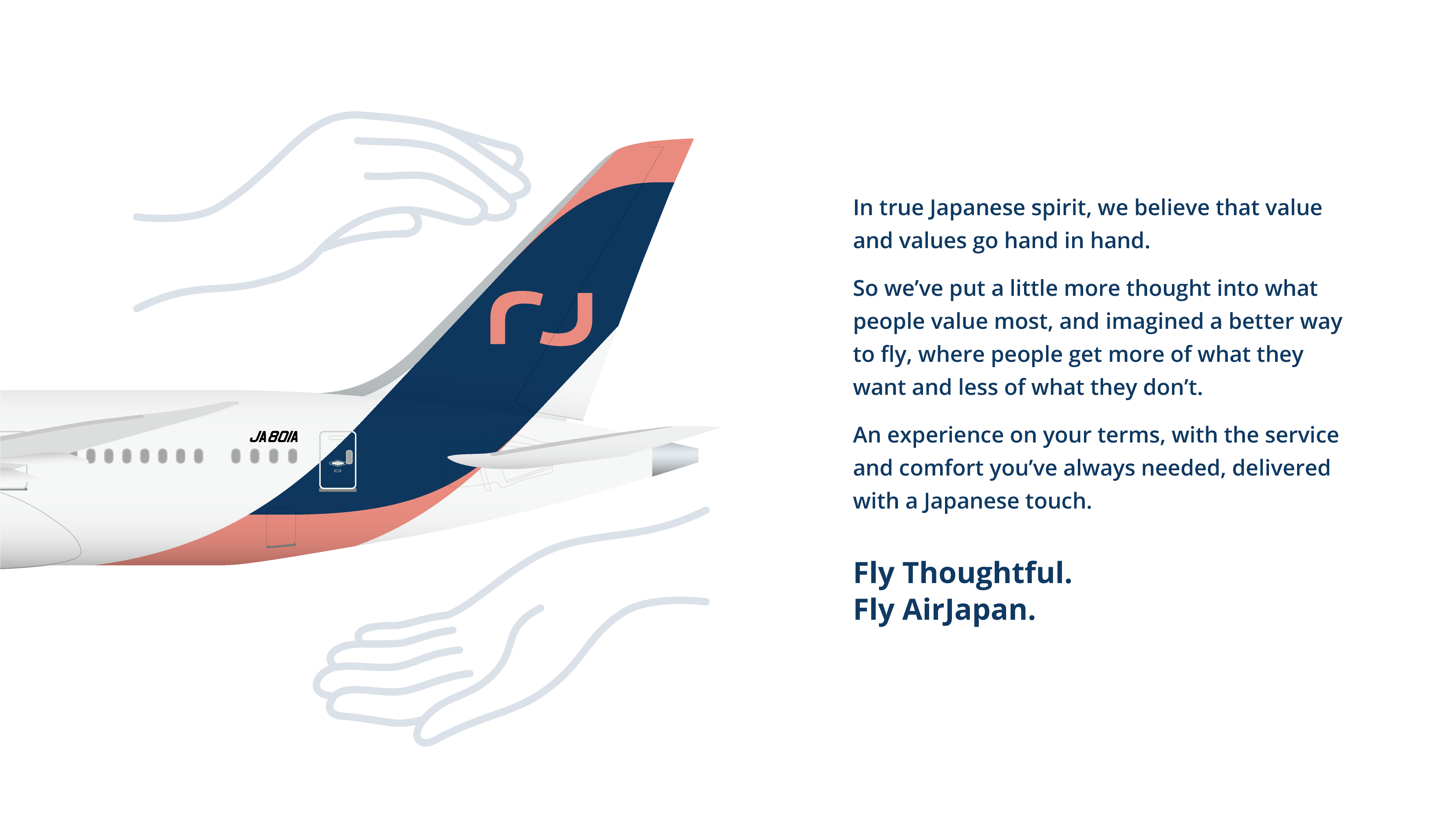 我們的目標(biāo)是創(chuàng)造一種全新的航空旅行體驗,既不是全方位服務(wù)也不是低成本航空公司 (LCC),結(jié)合了兩全其美,同時還具有日本風(fēng)格的理念和品質(zhì)。品牌理念可以用“Fly Thoughtful”這句話來概括,表達(dá)了航空公司的關(guān)懷、體貼和溫柔的態(tài)度。作為一家對所有人友好和關(guān)懷的航空公司,我們的目標(biāo)是基于日本理念和對質(zhì)量的承諾,創(chuàng)造一種全新的航空旅行體驗。
