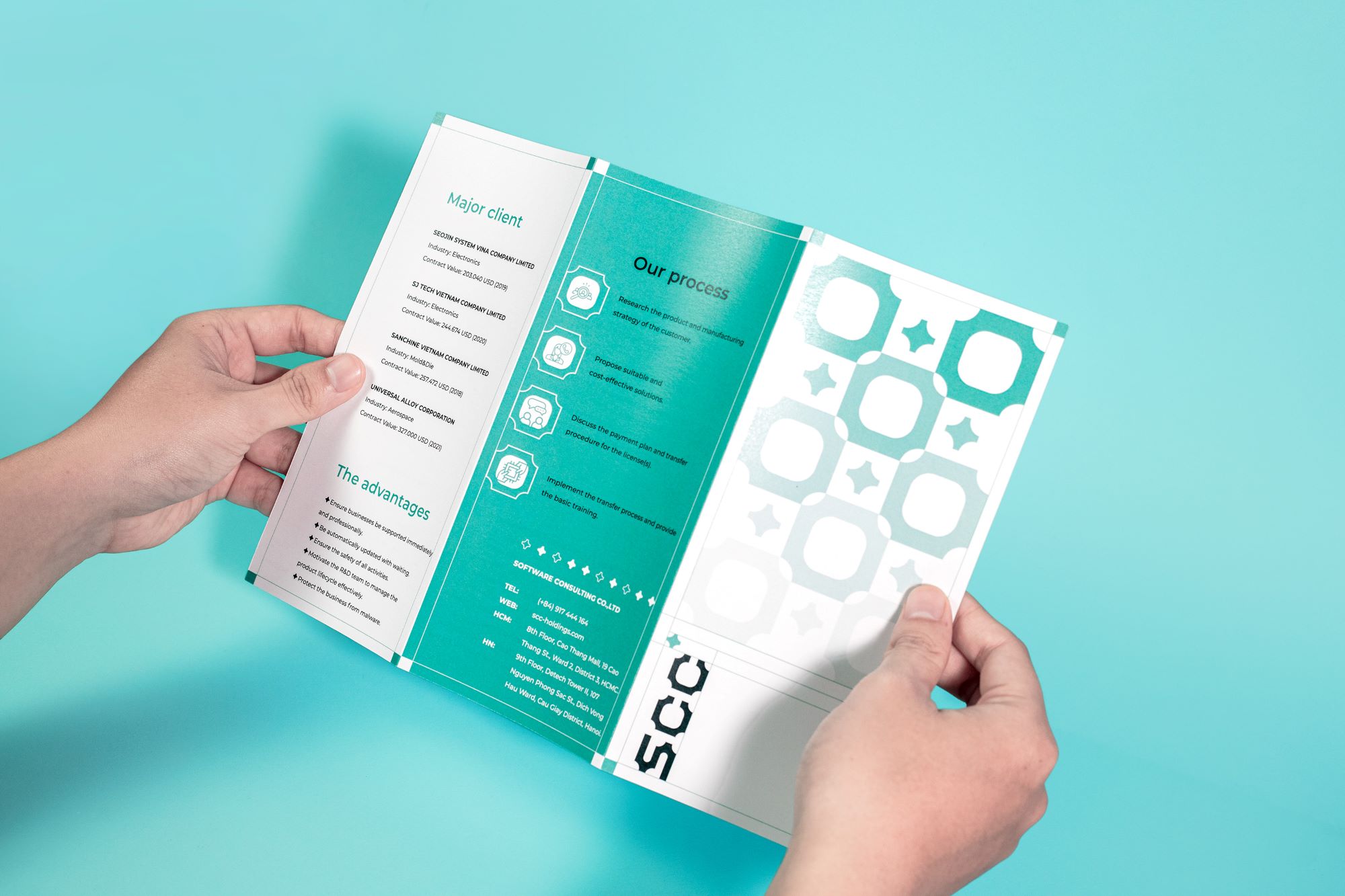 SCC在向客戶(hù)提供產(chǎn)品和服務(wù)方面有一個(gè)透明的愿景。為了展示品牌價(jià)值的清晰和透明,Vu將“透明”作為這個(gè)項(xiàng)目的主要概念。我們通過(guò)圖標(biāo)、顏色和其他視覺(jué)品牌形象設(shè)計(jì)等圖形元素來(lái)展示它。