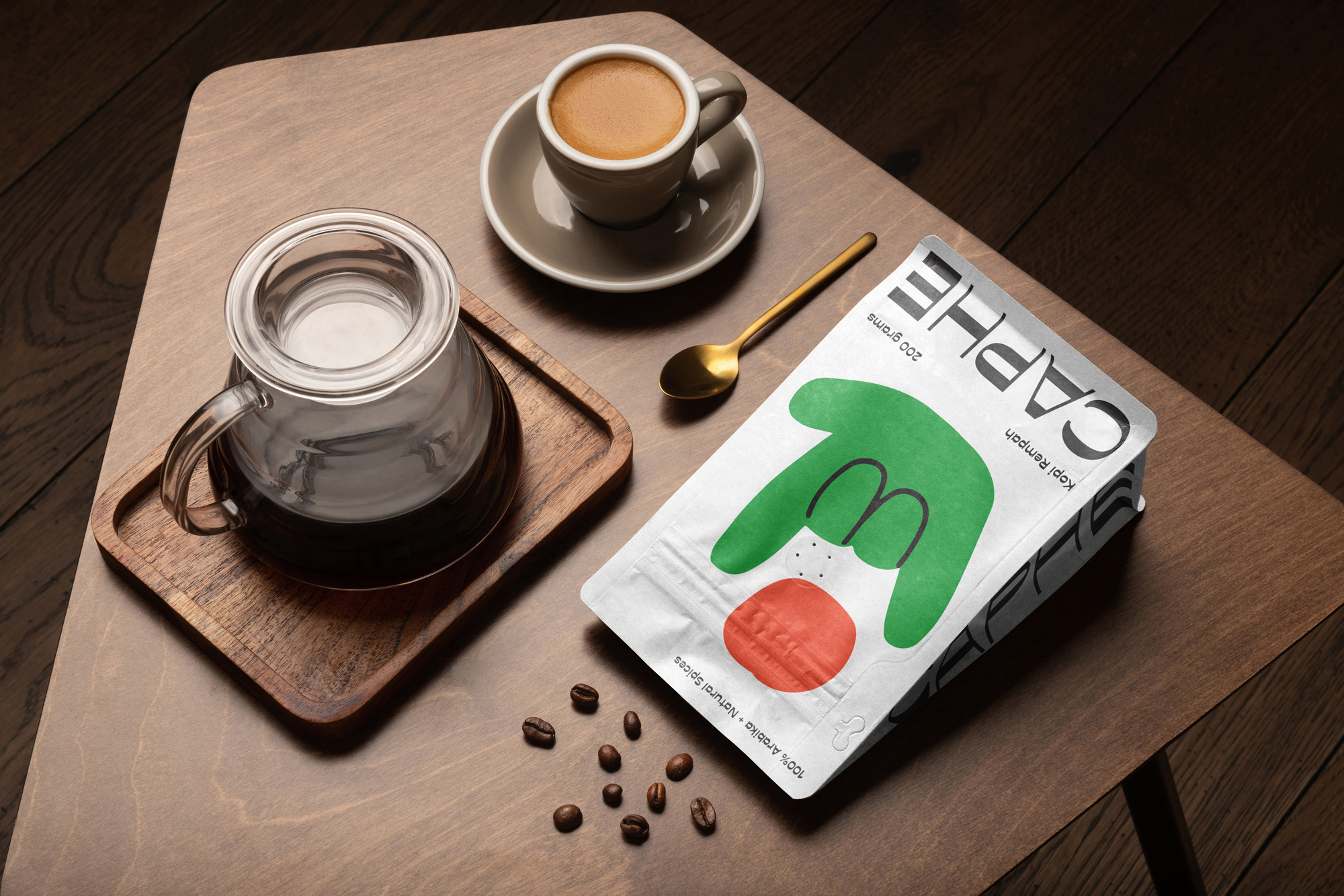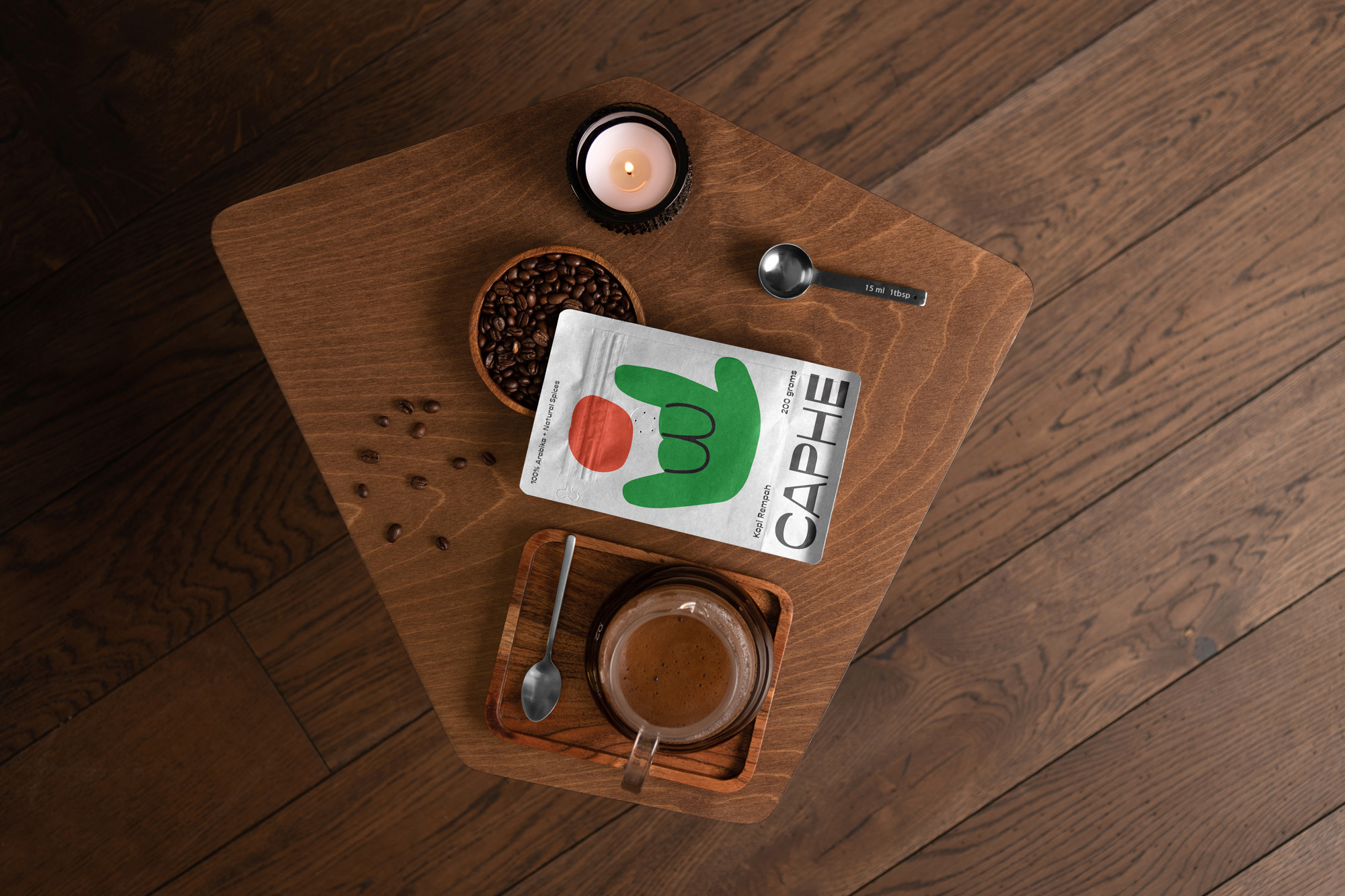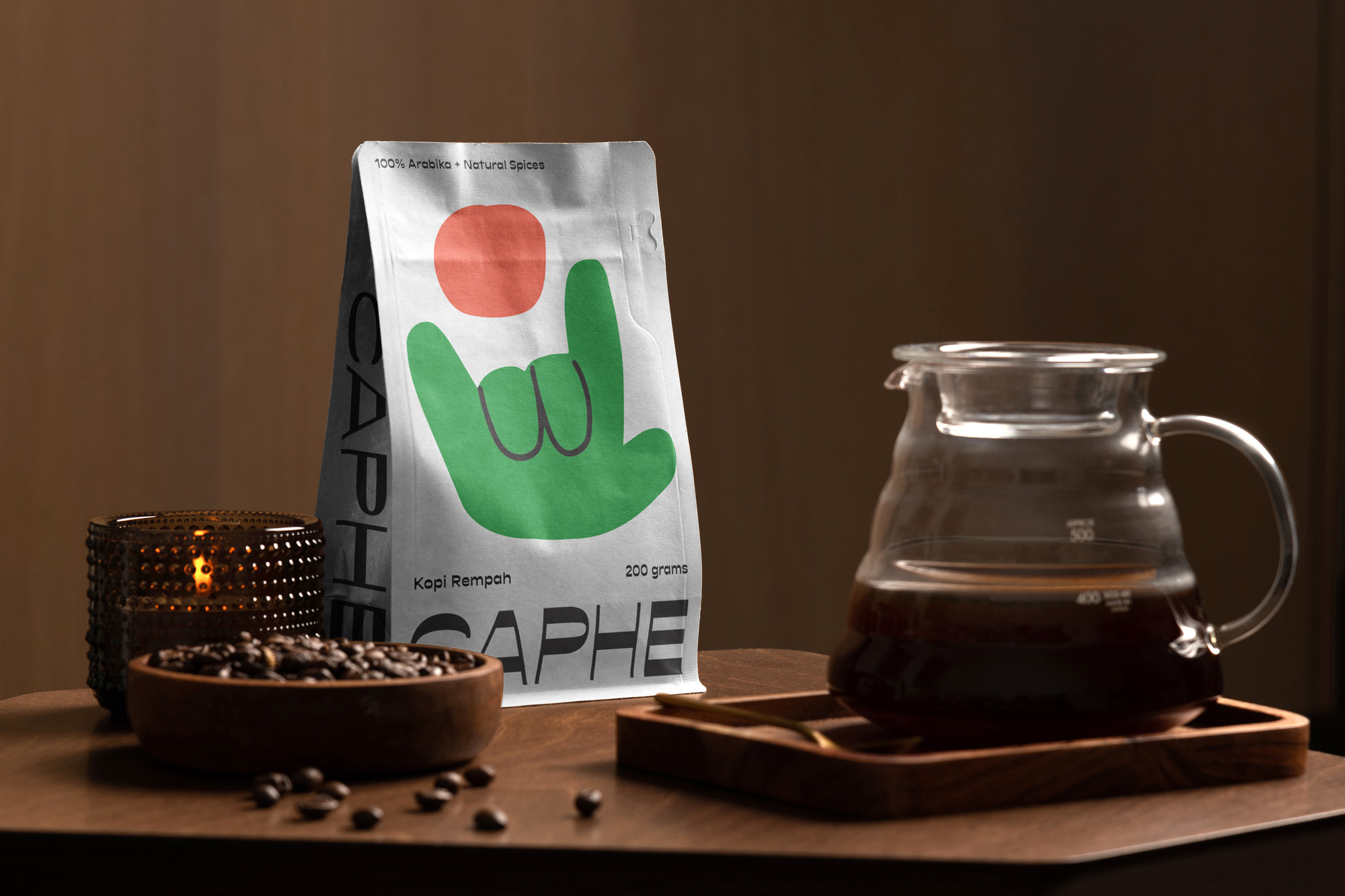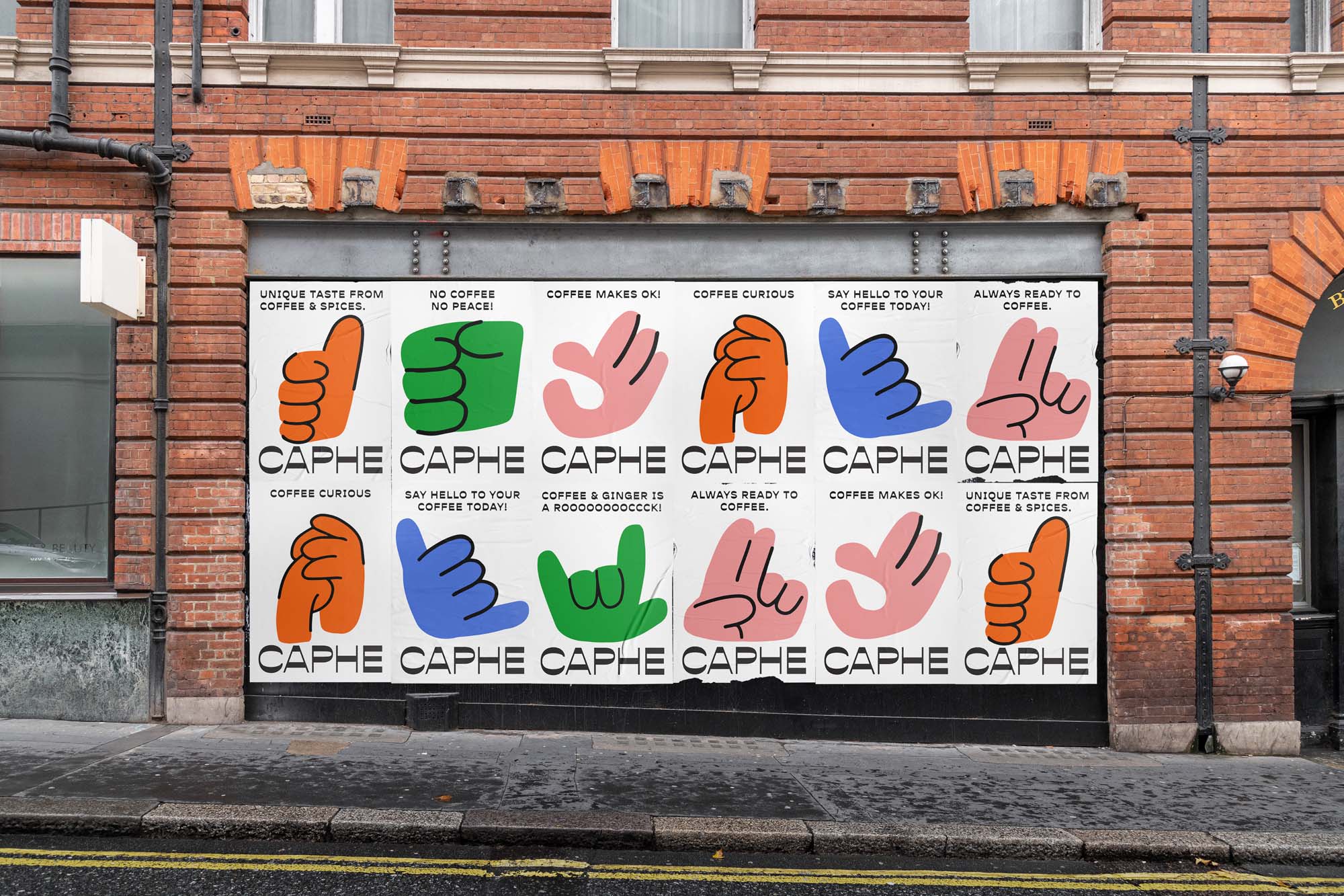 我們選擇Opposit作為Caphe的字體,這種字體是獨一無二的,字母的每個字符上都有粗而細的筆畫。在包裝設(shè)計中,我們試圖拋開以咖啡為基礎(chǔ)的包裝設(shè)計思想。與大多數(shù)咖啡設(shè)計不同,姜汁咖啡自動地以姜汁插圖為特色,這太普通和無聊了。我們設(shè)計了一個手勢的插圖,作為享受咖啡的滿足感的標志。除了是包裝上的一個身份和設(shè)計,這個插圖也是一個附屬于品牌的圖像。它與眾不同,獨一無二,引人注目。