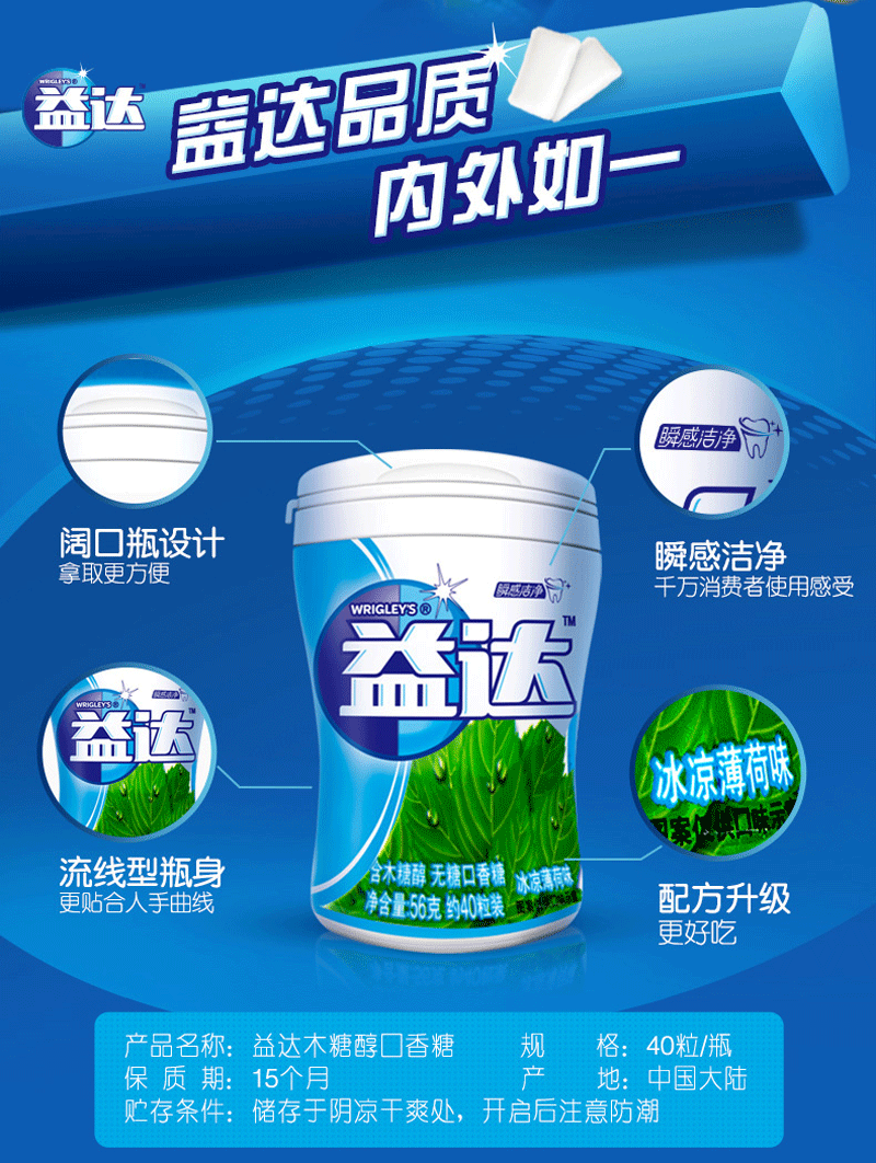 品牌主張:口味卓越的無糖口香糖,擁有多種口味。益達品質(zhì),內(nèi)外如一。