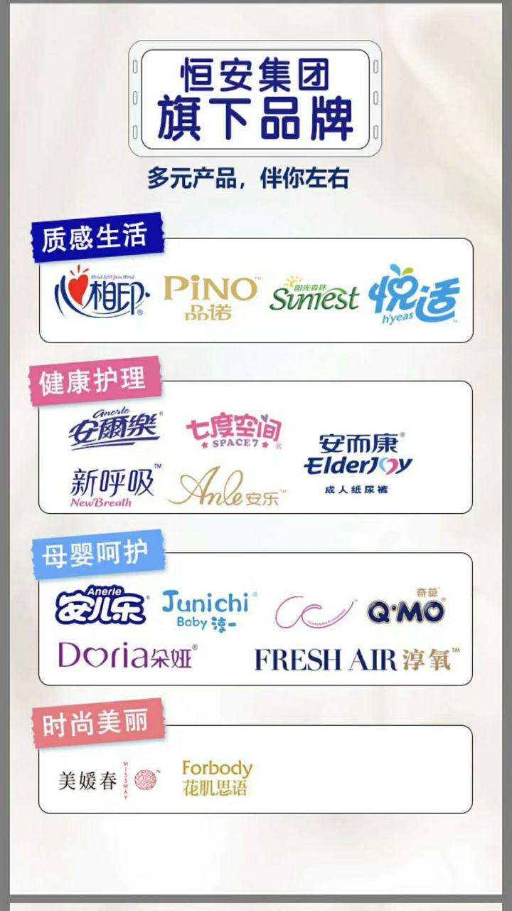 品牌介紹:恒安集團創(chuàng)立于1985年,經(jīng)營領域涉及婦幼衛(wèi)生用品、紙類產(chǎn)品、化妝及護膚類產(chǎn)品等,是國內(nèi)最大的婦女衛(wèi)生巾和嬰兒紙尿褲專業(yè)生產(chǎn)企業(yè),擁有固定資產(chǎn)二十多億元,員工一萬余人,在全國17個省、市、自治區(qū),投資設立40多家生產(chǎn)公司,在全國設立40余家分公司以及200多個銷售團隊、上萬人業(yè)務人員遍布全國城市、鄉(xiāng)村,提供優(yōu)質(zhì)服務,保證公司產(chǎn)品對市場需求做出快速反應。 恒安國際集團有限公司于1998年在香港成功上市。
