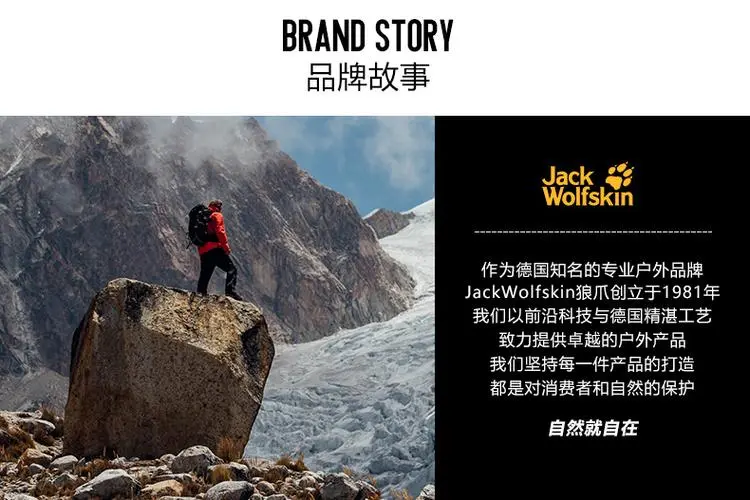 品牌寓意:品牌名Jack Wolfskin寓意對(duì)最高的產(chǎn)品要求和對(duì)野外最美好的向往,也意為大自然里最厲害的保護(hù)層。