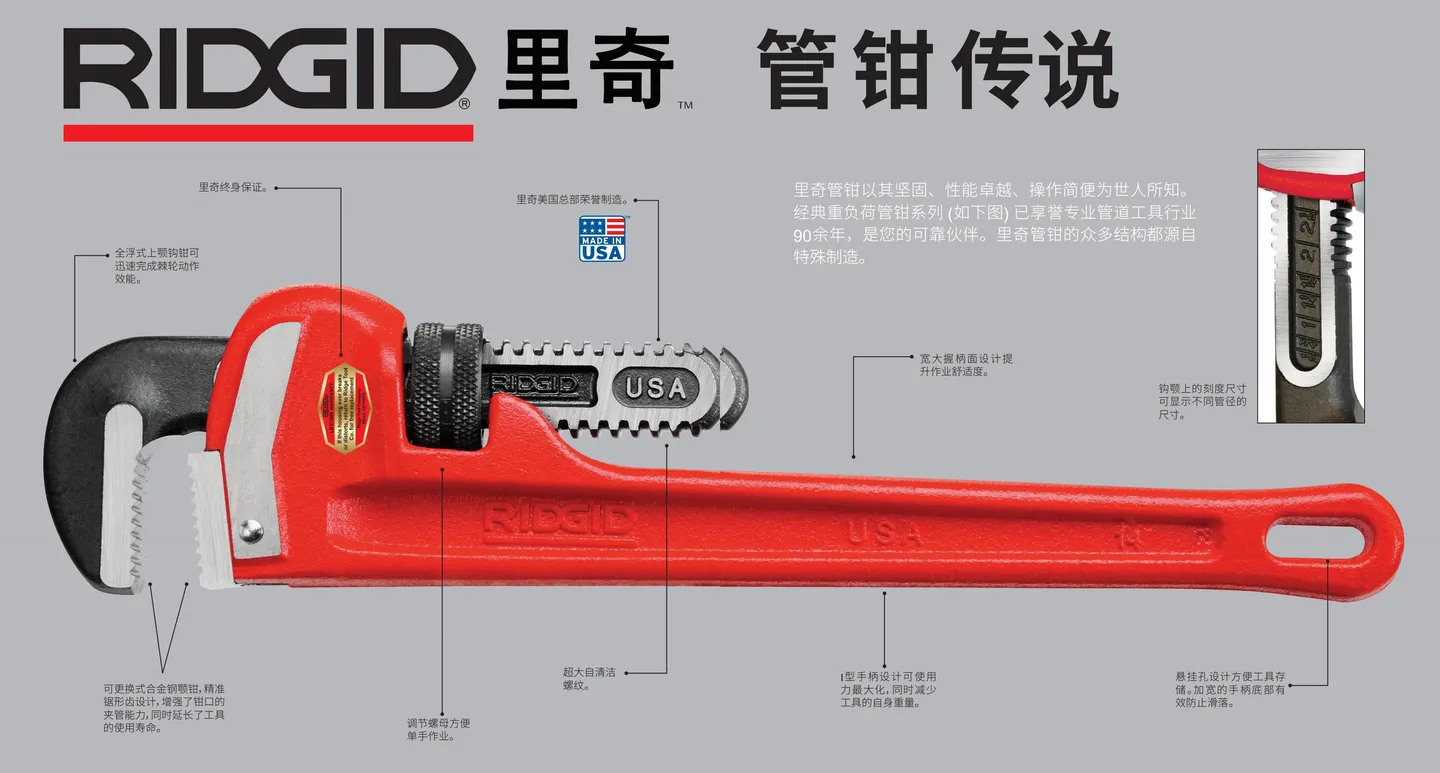 里奇創(chuàng)立于美國(guó),里奇致力于幫助商業(yè)、工業(yè)和能源市場(chǎng)的專業(yè)人士提升世界各地基礎(chǔ)設(shè)施建設(shè)運(yùn)維的安全性及效率 ,提供300多種、4000多個(gè)型號(hào)的可靠、創(chuàng)新的工具,包括管鉗、手動(dòng)管道工具、電動(dòng)套絲機(jī)、管道疏通機(jī)、管道內(nèi)窺檢測(cè)工具、管線定位儀、管道壓接工具及電動(dòng)工具等