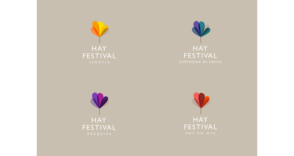 “Hay Festival”以無襯線字體出現(xiàn)在樹旁或樹下的堆疊線條中,以大寫字母排列,威勒稱其為“經(jīng)典”,帶有“烏托邦式的感覺”。核心標識的每一根樹枝都被設置成不同的顏色,包括紫色、粉色、橙色和黃色。該標志以多種顏色出現(xiàn),代表了該節(jié)日分支的不同地點,比如西班牙塞戈維亞姐妹節(jié)的不同黃色色調,以及秘魯阿雷基帕的一系列紫色。威勒表示,logo選用了“充滿活力”的調色板,背景采用了“更平靜”的色調,用以鼓舞和娛樂人們。
