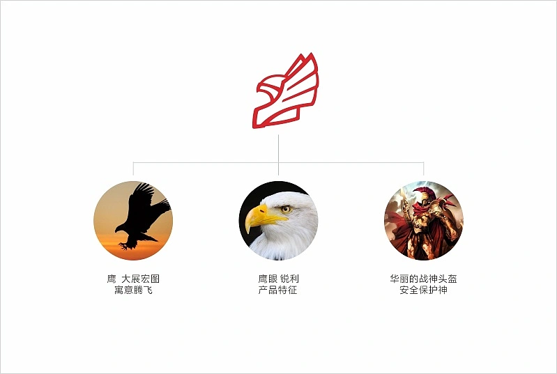 看似冰冷的工業(yè)品也應(yīng)該與人類建立溫暖的情感關(guān)系。創(chuàng)新進(jìn)取、技術(shù)高超、勇敢堅(jiān)韌,掌門神是守護(hù)人類安全的可靠衛(wèi)士。易品牌設(shè)計(jì)小組以守護(hù)神作為原型,提取最能表達(dá)守護(hù)神形象的“戰(zhàn)神頭盔”作為品牌LOGO主體元素,融入具有宏大、騰飛寓意,且象征掌門神產(chǎn)品非常敏銳的“獵鷹”元素,以紅色和灰色作為品牌主色調(diào),形象威猛、硬朗中不失親切感。以“可靠&信賴”作為超級(jí)符號(hào)的創(chuàng)作理念,整套視覺(jué)系統(tǒng)呈現(xiàn)高端感、品質(zhì)感、國(guó)際感、可靠感